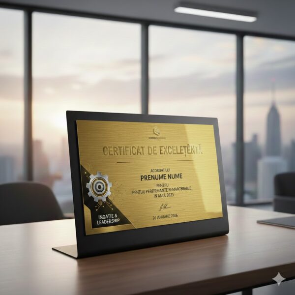 Diplomă Premium „Placă Metalică” pe Suport PVC – Model Stand-Alone