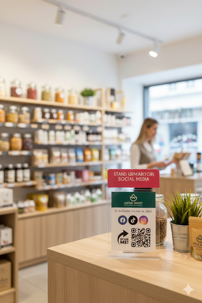 Cu designul său cool, stand-ul de urmaritori Social Media trezește interesul clienților si îi încurajează să vă urmareasca pe retelele sociale. Tot ce trebuie să facă clienții tăi este sa scaneze QR codul de pe stand și se va deschide o fereastra pe telefon, care va duce direct la pagina dvs sociala! Nu este necesară nicio aplicație separată!